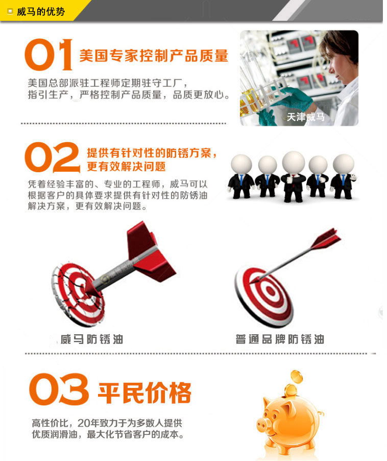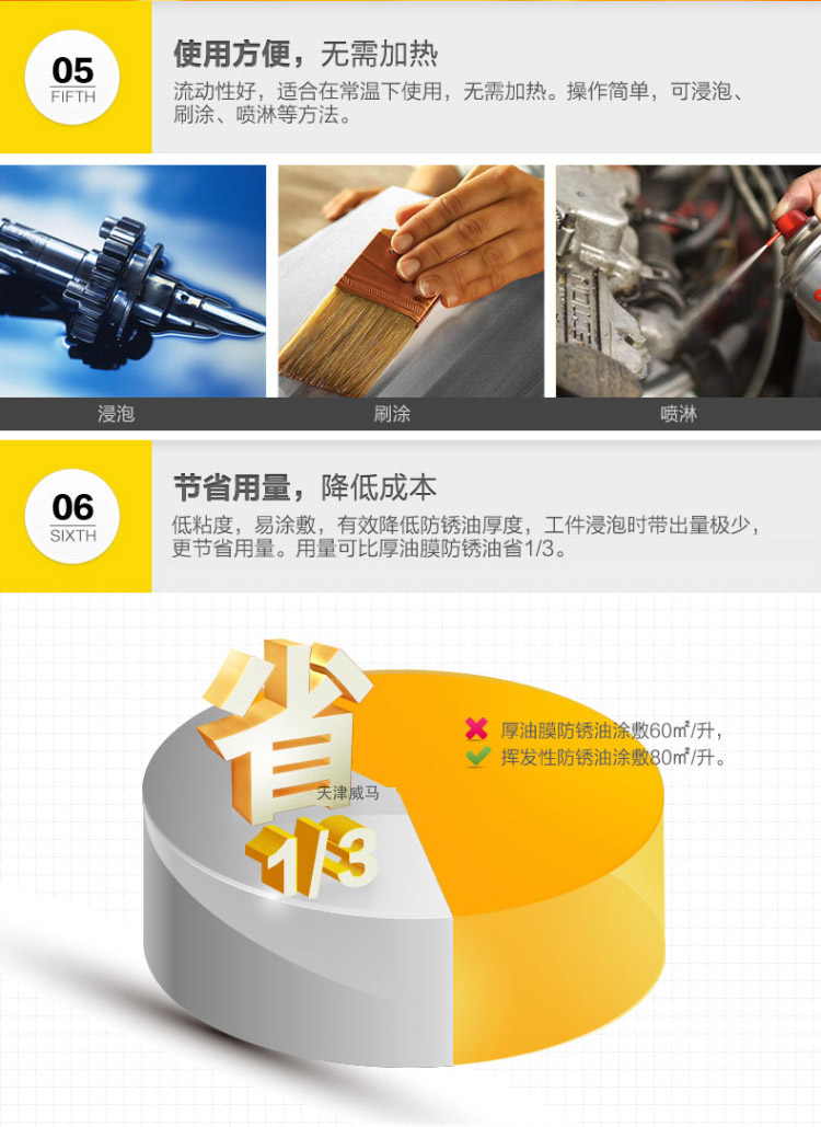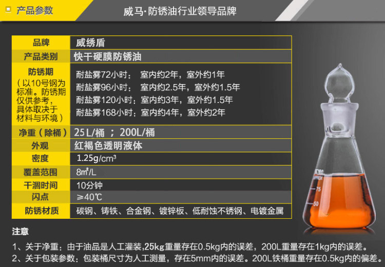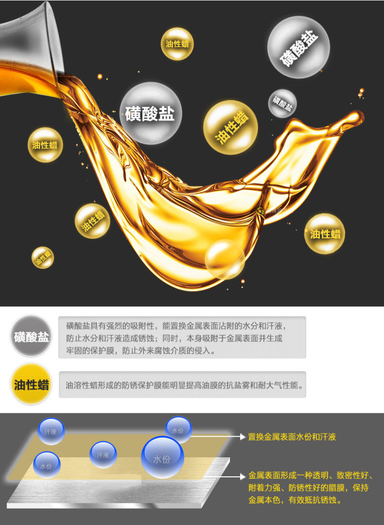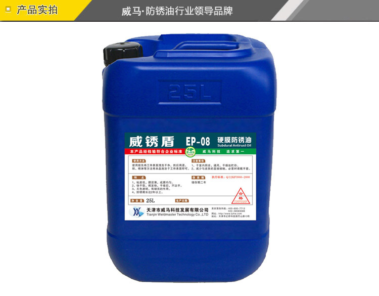 威銹盾EP-08硬膜防銹油是一種無色透明低粘度液體防銹專用品,以樹脂為成膜材料,加入高分子防銹添加劑并用精致石油溶劑配成的防銹油。本品在金屬表面成膜迅速、油膜堅固、透明而均勻,決不沾手,有良好的耐磨耐熱性能,防銹時間持久。可在各種環(huán)境下長期保存不銹蝕。本品使用簡便,設(shè)備簡單,刷、浸、噴均可,不遮蓋器件原色,并有增光作用。EP-08硬膜防銹油為本公司的招牌產(chǎn)品,公司引進國外先進專利配方和生產(chǎn)工藝,研制開發(fā)出的新一代硬膜防銹油。經(jīng)測試,可以替代進口同類產(chǎn)品,歡迎測試,選購。